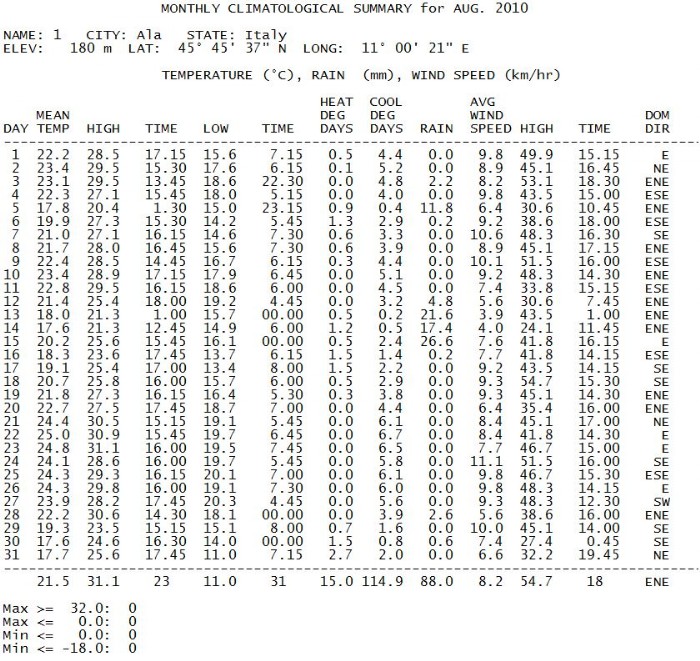 Primo weekend con tempo sereno, secco e limpido. Da lunedi 2 variabilità con addensamenti, breve piovasco nel pomeriggio del 3. Il giorno 5 inizia con pioggerellina leggera e copertura intensa stile autunnale, temperatura in netto calo. Dal giorno 7 tempo in miglioramento e temperature in ripresa. Da metà della 2° settimana nuovo peggioramento, si avvicina un sistema frontale da Nord Ovest, nuvolosità irregolare, in aumento. Inizialmente rovesci e temporali con temperature minime e massime senza variazioni significative. Dal 14 un sistema depressionario centrato sul Tirreno fa confluire correnti molto instabili, con nuvolosità in forte aumento. Dal primo pomeriggio transito del fronte e precipitazioni diffuse e persistenti. Nei giorni seguenti prevale ancora una circolazione ciclonica anche se meno attiva, nuvolosità irregolare, con isolati brevi rovesci e temperature in calo, specialmente nei valori minimi. Dal giorno 20 miglioramento e weekend con condizioni di stabilità, molto soleggiato con limitata attività cumuliforme e temperature nuovamente estive. Inizio 4° settimana con tempo estivo, soleggiato e caratterizzato da nuvolosità pomeridiane, senza fenomeni di rilievo. Il resto della settimana mantiene temperature elevate, a tratti afose, con nuvolosità sparse o foschie. Sabato 28 inizia con tempo soleggiato ma nel pomeriggio annuvolamenti estesi portano un breve ma intenso acquazzone, in esaurimento dal tardo pomeriggio quando l'arrivo d'aria più fresca dalle alte latitudini determina un calo delle temperature. Domenica inizialmente coperto ma poi soleggiato, lunedi 30 nuvoloso con pioggia leggera a metà giornata poi rasserenamento e nella notte del 31 deciso calo delle minime (fino a 11°C), giornata seguente fresca, cielo azzurro e soleggiato.