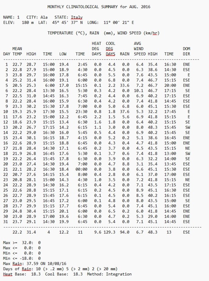 A fianco la tabella dei dati giornalieri in formato internazionale secondo lo standard NOAA