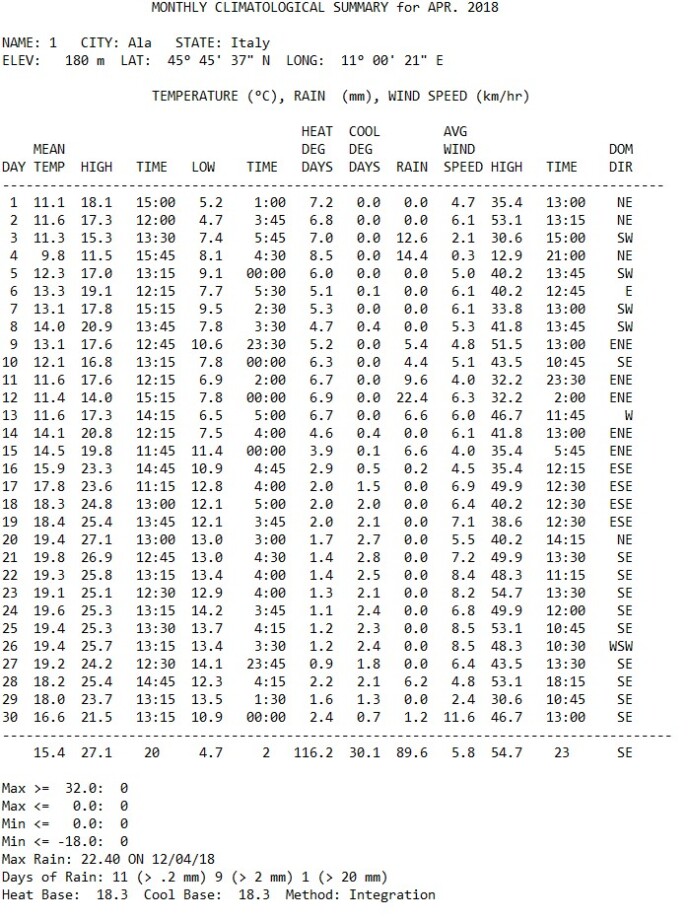 A fianco la tabella dei dati giornalieri in formato internazionale secondo lo standard NOAA