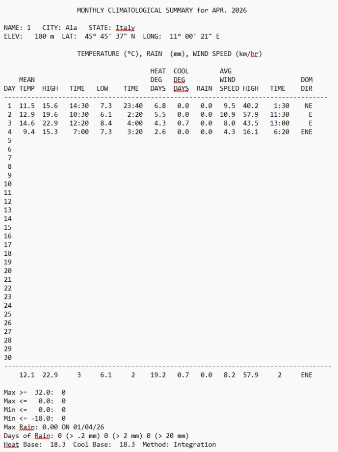 A fianco la tabella dei dati giornalieri in formato internazionale secondo lo standard NOAA