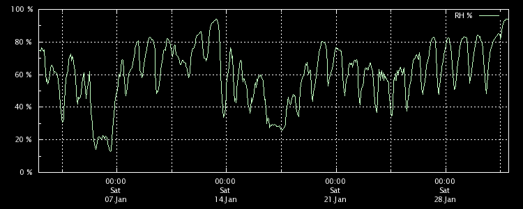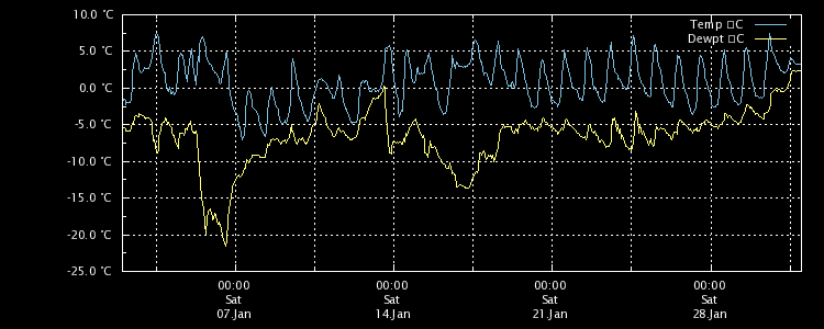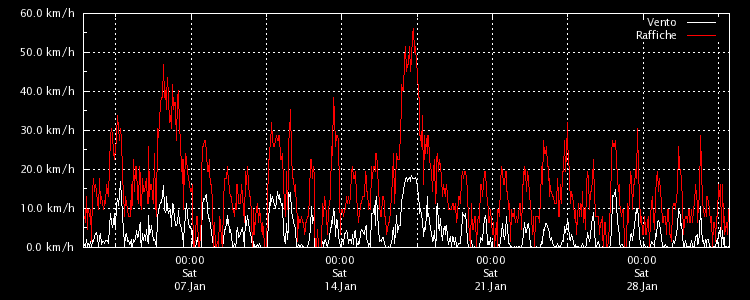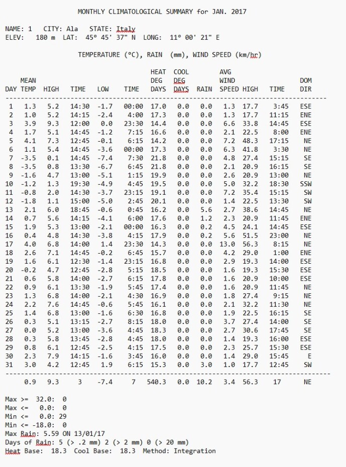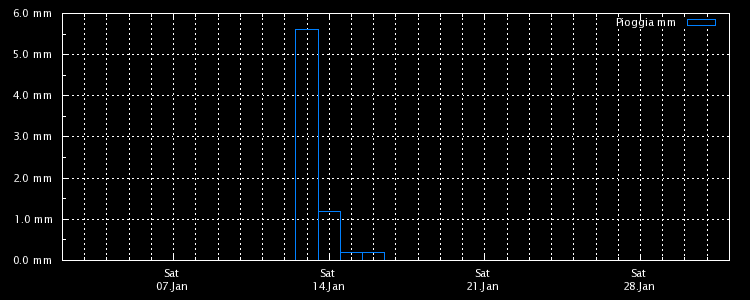 L'alta pressione che ci ha accompagnato per tutto dicembre con tempo sereno e assenza di perturbazioni perdura anche nella prima decade di gennaio. La variazione è soltanto nelle temperature che risultano in netto calo (minima di -7,4°C il giorno 7) ed anche le massime sono molto basse. Dalla sera di giovedi 12 la regione è interessata ad una debole nevicata, in esaurimento nella giornata di venerdi 13 che porta un accumulo di 10 cm circa e, finalmente, un paesaggio invernale. Schiarite e gelate già dal giorno seguente e, per tutto il mese, prosegue la fase di alta pressione con cielo azzurro e temperature rigide, minime sempre sotto lo zero. Soltanto il giorno 31 foschie e umidità e un sensibile rialzo delle temperature portano delle leggere precipitazioni.