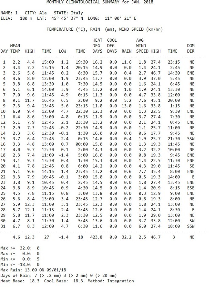 A fianco la tabella dei dati giornalieri in formato internazionale secondo lo standard NOAA